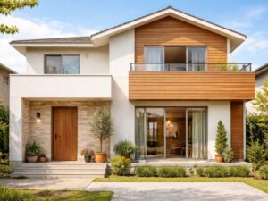 もし外壁のツートンをシンプル(白×ベージュなど)にまとめたなら、玄関ドアにだけパッと目を引く色(深い赤や木目調)を持ってくるのも非常に高度でおしゃれなテクニックです。